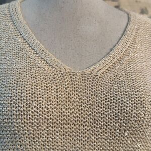 Very good condition! A loose stitch here and there that can be pulled through from the inside. Sweater gets it’s twinkle from the tiny sequins through out. Very flattering cut , with pleats front and back that open over the hips.