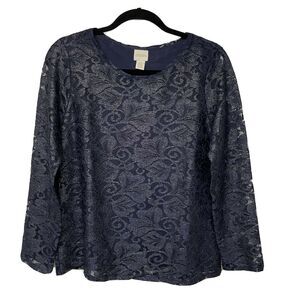 Chico's Gold & Navy Blue Foil Lace Top Size 0 Small/4 Metallic Sheer Sleeves