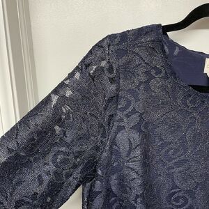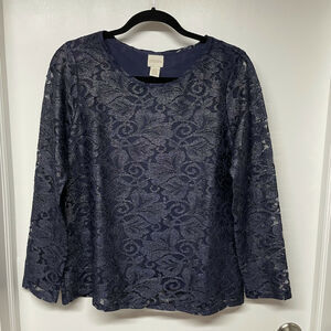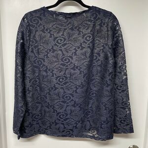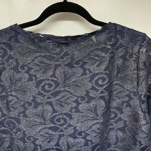 Chico's Gold & Navy Blue Foil Lace Top Size 0 Small/4 Metallic Sheer Sleeves.