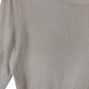 Excellent preowned condition. Gold shimmery long sleeve lightweight round neck pullover sweater. Zips up back. Rayon/polyester/metallic material. Approx. measurements: Shoulder to hem 24", pit to pit 20", sleeve from neck to sleeve hem 27". Size M.