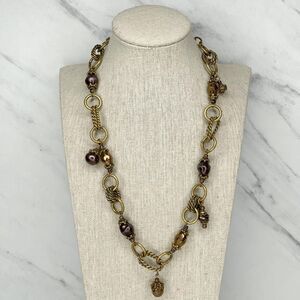 Gorgeous statement piece from Chico's! This mixed media necklace features alternating chain links and beaded elements in a beautiful gold tone finish. Perfect for elevating any outfit with sophisticated style!