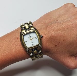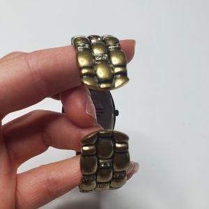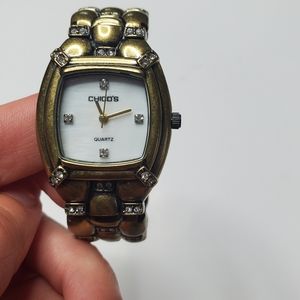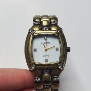 Chico's Women's Gold Watch W/ Diamond Like Studs. Adjustable in size as it does not clasp - spring like cuff. Stainless steel back. Very good preowned condition. Battery needs replaced.