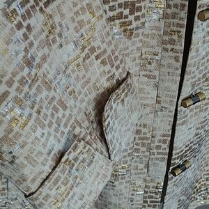 Chico's Gold and Glitter light weight Jacket. M/8, Chico's Sz 1. Gold and glitter light weight jacket. Barrell Buttons, Cute as heck. Fully lined. No pockets. EUC. great condition.