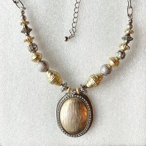 This necklace showcases an elegant blend of gold-tone and silver-tone finishes with intricate beadwork and a striking oval pendant. Its versatile design and adjustable chain make it a sophisticated accessory.