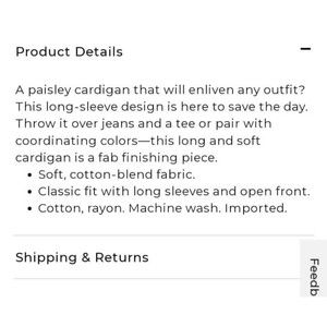 Brand new Grand Paisley Cardigan Sweater Size 2. Smoke free pet free home. I am listing additional new with tag items today and love ve to bundle!