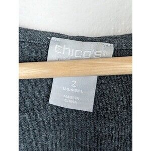 This is a Chico's open cardigan sweater in size Large. It is a gray color and features a cowl neck and a hoodie. It is made of a cotton cashmere blend.