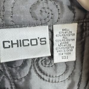 Excellent preowned condition. Chico's Gray Metallic Quilted Full Zip Mock Neck Lightweight Jacket. Nylon/polyester material. Approx. measurements: Shoulder to hem 25", pit to pit 21", sleeve from neck to sleeve hem 29". Size 2 (L).