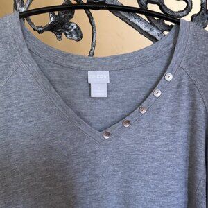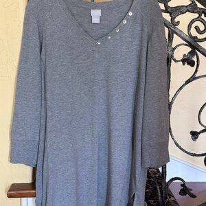 Nice gray knit tunic length top from Chico’s Boutique- has lots of cute detail- buttons at V-neck, ribbing on shoulder and down sides. 3/4 sleeve, split hem. Chico’s size 3 which is an XL. Retail $70. Plus tax. Like new from a smoke-free home.