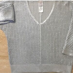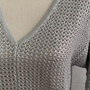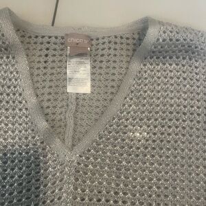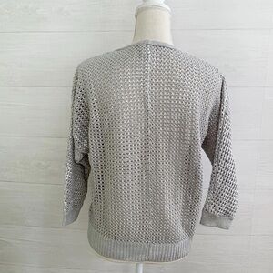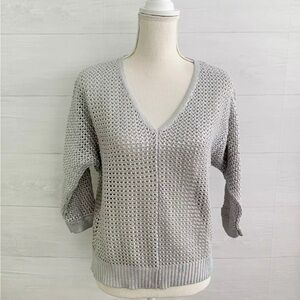 Embrace a minimalist style with this chic gray V-neck sweater from Chico's, featuring a textured waffle knit and a relaxed fit. The short sleeves and slightly cropped length add a modern touch, making it a versatile piece for any casual occasion.