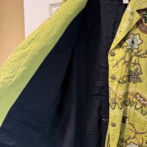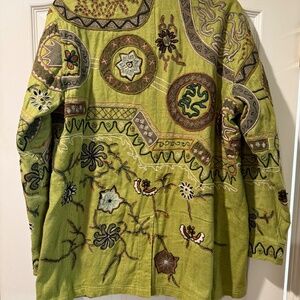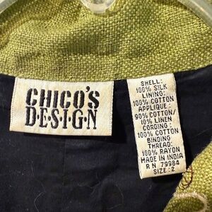 Chico's size 2 (large) green jacket, lined with black silk, and embroidered with earth tones. Two front pockets. Pre-owned, great condition.