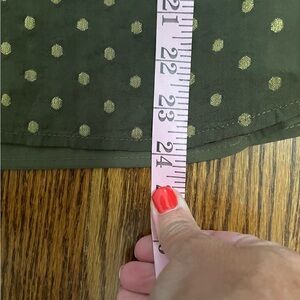 This is a super cute Chico's blouse in hunter green and gold with a floral design at the shoulders and mid arms. The sleeves are bell shaped, the waist flowy and a V cut at the neck. The blouse is lined and covered with gold dots. It is a Chico's size O, equivalent to a US 4 or small.