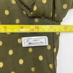 Preowned item in excellent overall condition. No odors, stains, or holes. Velvet trim and embroidered floral details. Golden polka dot.