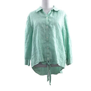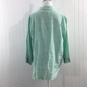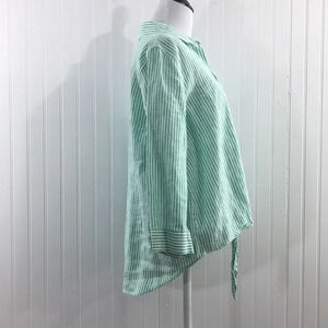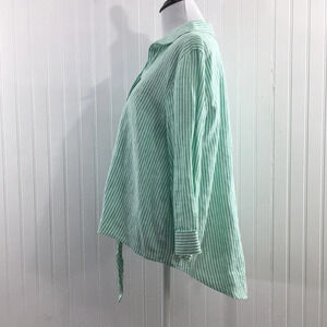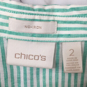 Chico's Green White Striped Button Front Shirt Womens 2 Large 12 Hi Low Linen. 3/4 Sleeve. Tie front. Non iron. 100% Linen. Pre-owned Condition- no flaws, no rips, stains, or holes.