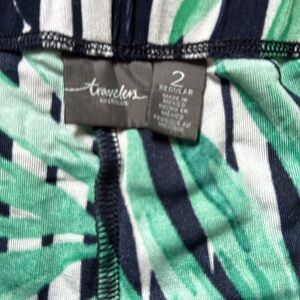 These chic palazzo pants from Chico's travelers collection feature a striking green and navy color scheme with a bold tropical print. Designed for casual wear, they offer a loose, flowing fit perfect for warm weather. The lightweight fabric and full-length design make them an ideal choice for a relaxed, stylish look. very good condition. All measurements are approximate inseam is 28"