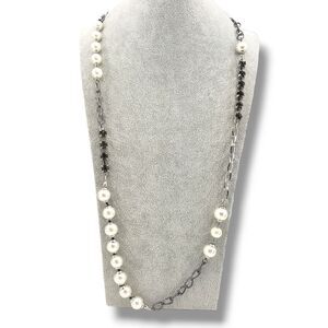 Chico's Gunmetal Gray Chain Faux Pearl Smoke Rhinestone Satellite Bead Necklace