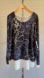 Chico's blouse with bold floral pattern. Black base with purple and white accents. Elegant and versatile design.