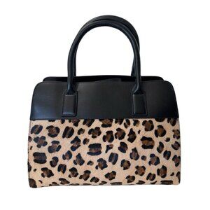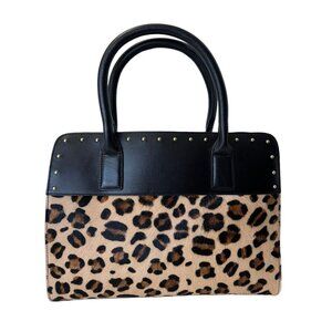 Chicos Haircalf Leather Leopard Animal Print Tote Bag Purse Double Handle Removable Crossbody Strap