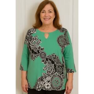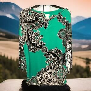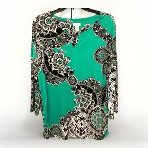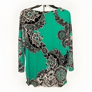 Chico’s Helena Style Poly Tunic Top Green BlackWhite Floral Sz 3 16 Colorful