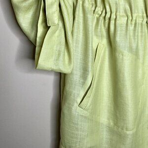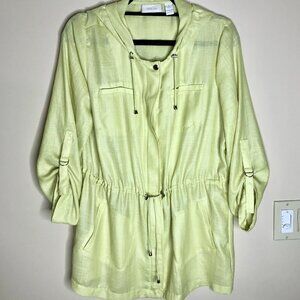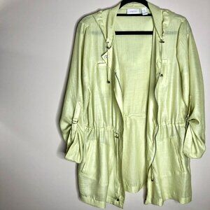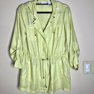 Spring into spring with this cheerful lime green linen-look zip-up jacket. This cute jacket has lots of detail: a hood with silver toggle adjusters, drawstring waist with silver toggle adjustments, silver loop adjustments for changing the length of the sleeves, and zips all the way to the neck with a silver button closure. (See all pictures to see the different ways to wear this versatile jacket.) There are two drop pockets at the chest and two pockets at the bottom. The 100% polyester has a linen texture and look, and is machine washable! Worn only a couple of times, this jacket is in like-new condition. Wear it to the gym, wear it to the beach, wear it to work, wear it to dinner! Such a cute and versatile jacket for spring, summer and fall!