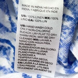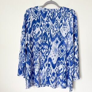 Chico's Ikat Linen Split Neck Tunic Top Womens Large Blue White Coastal Mature