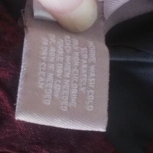 Chico's open-front jacket/blazer. Dark red quilted crinkle satin, lined, full-length sleeve with notched cuff. Poly/rayon shell with polyester lining, machine washable. Very good used condition. Chico's size 1, equivalent to a medium/8-10 in standard sizing.