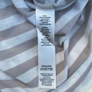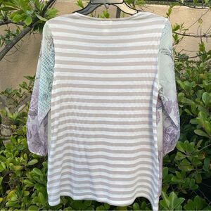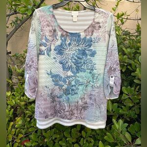 Chicos Ivory, Blue & Purple Floral Shirt/Top with Tank Size Small Chico Sizing is a "0" - Very nice pre-owned condition. Three quarter roll tab sleeves. Attached cream and ivory tank front top that extends past the hem. Stripes complement the floral pattern and add interest. Perfect for travel as its wrinkle free. Ships from a smoke and pet free home.
