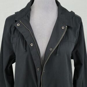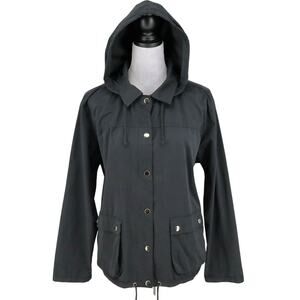 Chicos Jacket 3 Women's XL Black Full Zip Snaps Removable Hood Pockets Drawstring