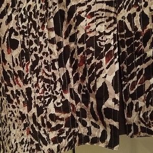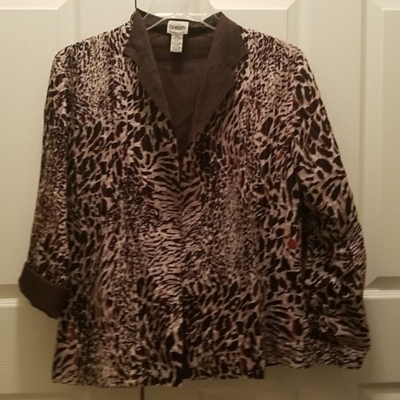 Size 1 Chico's jacket in an animal print of black, ivory, brown and rust. The outer shell is tucked as well as the lining which is brown.