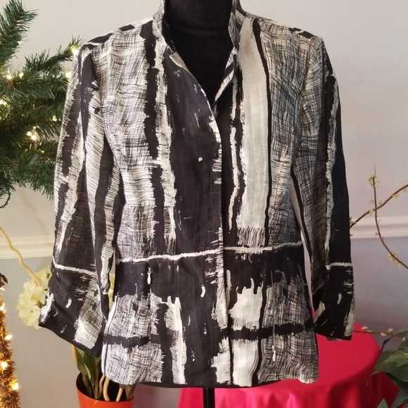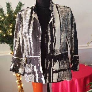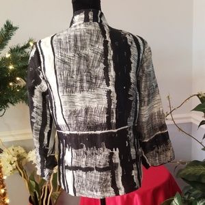 Black and white jacket with 3/4 sleeves. 88% linen & 12% nylon. Works with dress slacks, skirt or jeans