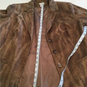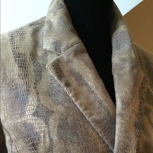Great snake skin looking lined jacket. Dress it up or dress it down...especially with jeans. Button up with pockets. Measures when buttoned across chest 21-1/2”, back of neck to hem 25”, arm length 17”. Smoke free home.