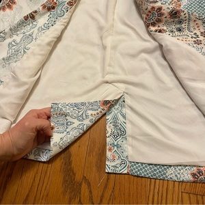 I always love a Chico’s Jacket!! This one has sweet paisley pattern made up of cream, peach and teal. Instantly steps up an outfit! Excellent condition. Chicos size 3 (XL). Approximate measurements below.