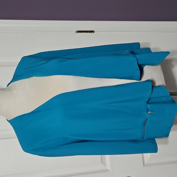 Beautiful turquoise drape front jacket has 3/4 sleeves and zippered pockets.