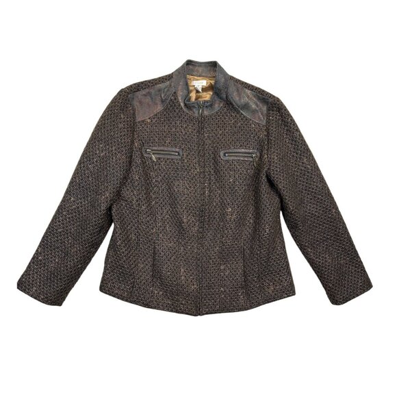 Chicos Jacket Blazer Womens Size 2 Brown Tweed Metallic Leather Trim