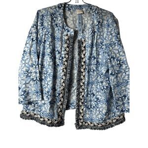 Chico's Jacket Boho Cottage Blue White Beachy Fringe 100% Linen Open-Front