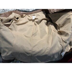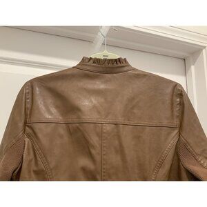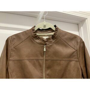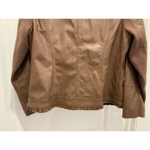 Chicos Jacket Small (1) Brown Vegan Faux Leather Sleeves Ruffle Trim Zip Lined