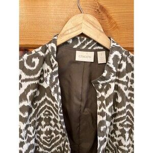 This is a Chico's women's jacket in size M with a brown and beige geometric print. It is a short, cropped jacket with 3/4 sleeves and an open front closure. The jacket is lined and made of 91% cotton and 9% metallic material. It is suitable for various occasions such as travel, casual wear, workwear, or business attire.