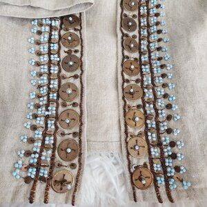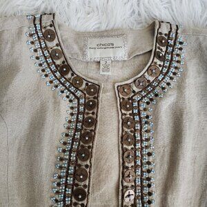 Chicos Jacket Women's 2 L 12 Embellished 100% Linen 3/4 Sleeves Tan Boho Casual