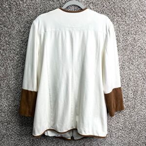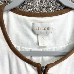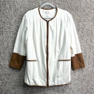 Excellent used Condition Women’s Chico’s Ivory White and Brown Suede Trim Zip Up Ponte Jacket in Size 3 / X-Large / 16