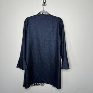 This eye-catching open front jacket features a textured brocade fabric with an abstract floral and botanical pattern in navy, silver, plum, tan, and soft blue. Elegant statement bell sleeves add a stylish touch, and the garment is fully reversible to a solid navy blue for versatile wear. Unstructured collarless design, mid-thigh length, and chic drape make it perfect for layering or as a standout piece.