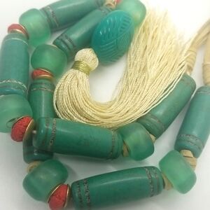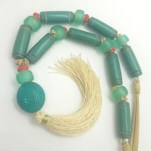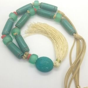 Chico's Beautiful Asian Inspired Jade Green Necklace with Stones of Various Textures, Shapes and Sizes. Orange Accents, Suede Rope & Cream Tassel. Really Gorgeous & Easy Way To Spice Up Your Outfit! 46
