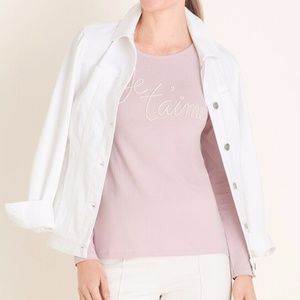You'll say je t'aime to this super-soft, cotton-blend tee, styled with long sleeves and a flattering scoop neckline. With a soft pink color and pearly details for the script, it doesn't get more feminine than this. French inspired. Soft, cotton-blend fabric. Classic fit with long sleeves and scoop neckline. Length: 26". Chico's size 0 is a US Sz S/4. Great clean condition. Sold out online.