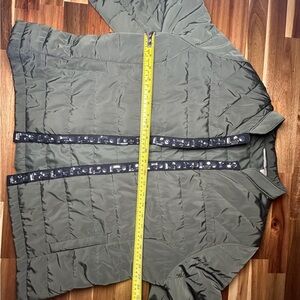Stylish olive green quilted jacket. Features a sleek design with large jewel trim. Open front. Light weight puffer feel. Color is most accurately reflected in the first (stock) photo.