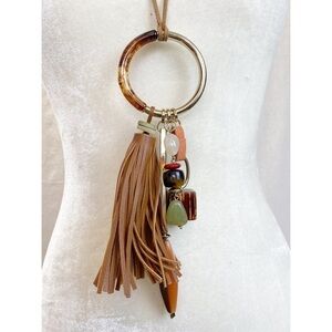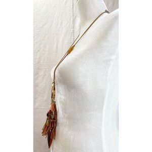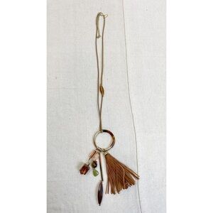 Bewitching by way of tribal-inspired charms, this extravagant tasseled necklace offers up a rich infusion of neutrals in full mixed-media detail.