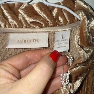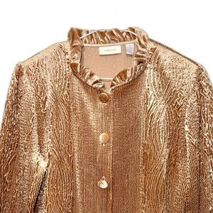Chico's Keily Crinkle Velvet Ruffle Trim Jacket - Gold 1. This item is new with tags. Size chart in photos.
