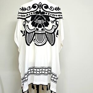Stylish ivory kimono with bold black embroidery. Ideal for chic layering.