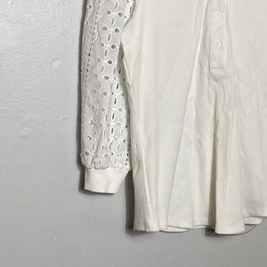 This Chico's Knit 3/4 top in size M is a stylish and comfortable addition to any woman's wardrobe. Made from a blend of spandex and cotton, the top features a round neck, button closure, and embroidered accents. The white color and knit fabric make it perfect for casual occasions, and the brand's quality ensures a durable and fashionable piece. With a sleeve length of 19 inches, this top is designed for regular size women and represents a versatile and chic choice for everyday wear. Armpits to armpit 18.5 more stretch Top length 18” inches Shoulder 13.5”