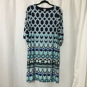 Chico's Knit Stretch Dress 1 Aqua Navy Blue White Geometric Work Church D1