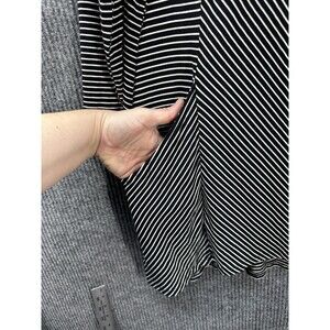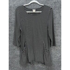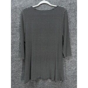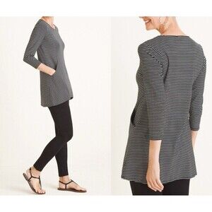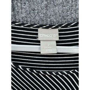 Chicos Knit Tunic Top Size 2/Large Black White Pockets Striped 3/4 Sleeve Scoop Neck. Excellent pre-owned condition with no flaws found. Measurements in photos. Chicos chart in photos. Fast shipping!