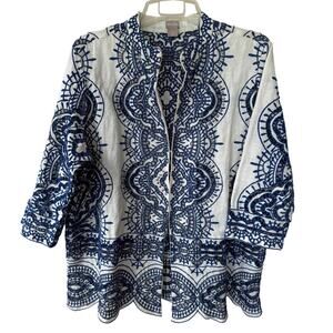 Chico’s LINEN Size 16 Cutouts beaded Silver thread Jacket blue white