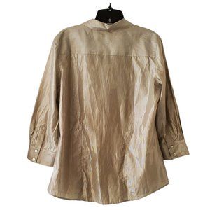 Chico's beautiful silver metallic shimmery button-up blouse enhances the look of any outfit with its metallic sheen and elegant tailoring. This versatile blouse pairs flawlessly with everything from denim jeans to layering essentials under blazers, while offering luxurious comfort and ease.